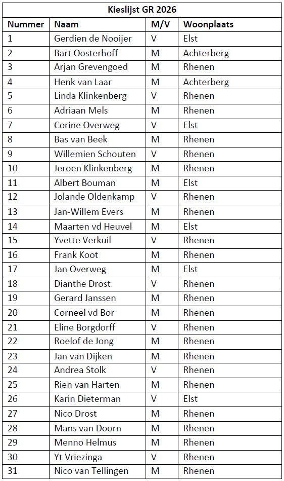 Tijdens een druk bezochte ledenvergadering werd unaniem voor Gerdien de Nooijer gestemd als onze lijsttrekker. In haar speech gaf ze aan de ze wil werken aan "Ruimte om mee te doen!" Haar keuze om voor de foto bij het woord Samenwerken te gaan staan verbaast dan ook niet, want zonder elkaar kunnen we niet. Met een goed gevulde kieslijst met meer dan 30 mensen die hart hebben voor Rhenen, Elst en Achterberg kan de campagne beginnen.